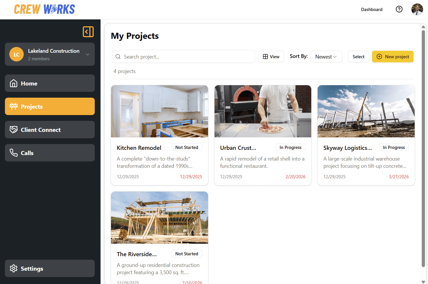 Project creation: Set up new or existing projects with a description, deadline, status, and an image. Then add tasks and files using the built-in task and file manager, keeping your crew and documents organized from start to finish.